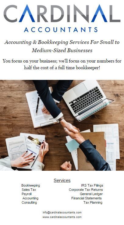 Cardinal Accountants is a full service Accounting Firm that utilizes technology to ensure their clients are getting their financials timely and accurately.They are helping business owners by letting them run their business without worrying about bookkeeping, sales tax, payroll, and tax returns themselves. They handle everything a bookkeeper and CPA would handle for a fraction of the cost! Learn more on their website at cardinalaccountants.com